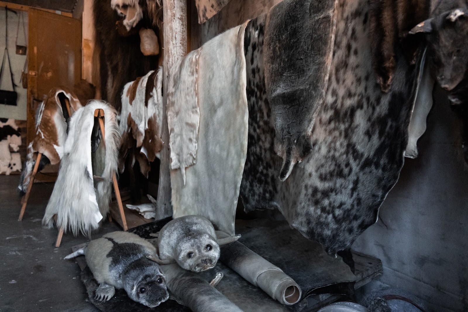 The collection was nothing short of magnificent, and Eli’s obscure obsessions made me feel I’d found yet another kindred spirit on the road. But what caught my attention most weren’t the relics in his shop, but the massive skins hanging in the container next to his office. These were the skins of both a Greenland shark and a polar bear. Meticulously carved from their deceased hosts, they looked like something out of a natural history museum.