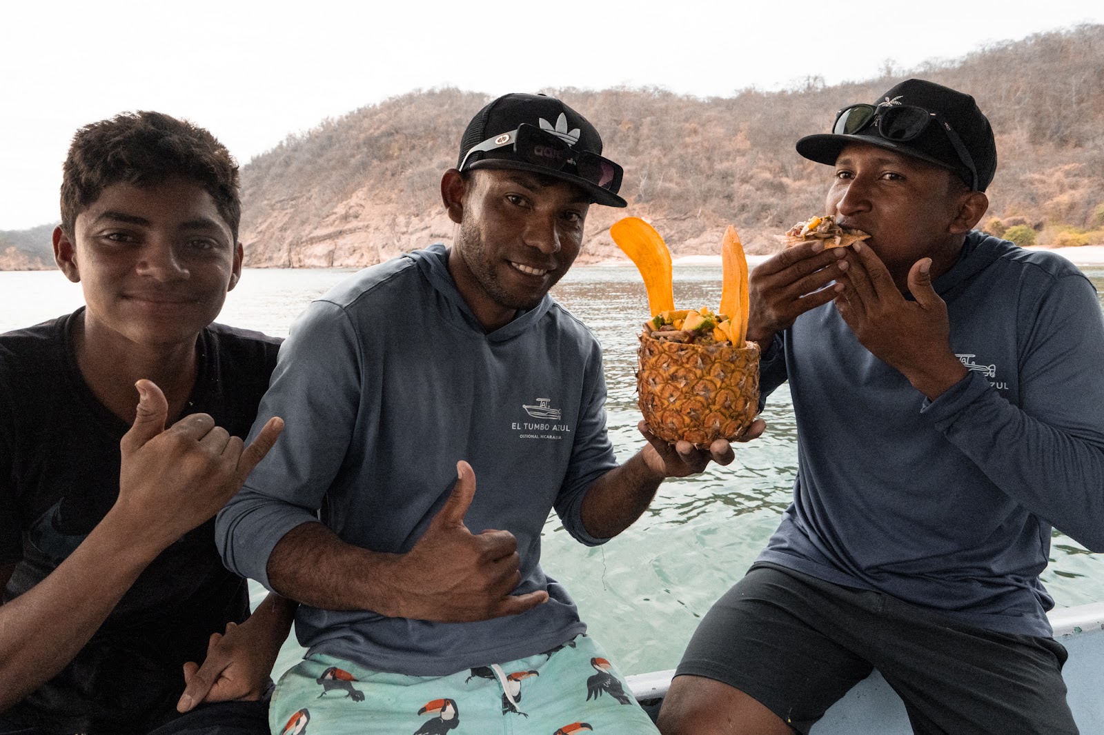 Before venturing into eco-tourism, Alex and Carlos had worked together in a restaurant, where they crafted their unique take on traditional Nicaraguan ceviche. This dish had since become their signature—a favorite they love sharing with newcomers. Their secret ingredients included passionfruit, limes, avocado, and pineapple, adding a tropical twist to the classic recipe. Onboard, Carlos expertly fileted the fish while Alex prepared the fruits and vegetables. Alex served us the ceviche in a beautifully carved pineapple half, perfectly garnished. With a smile, he shared that the ultimate ingredient was love, making the meal not just delicious but one for the books.