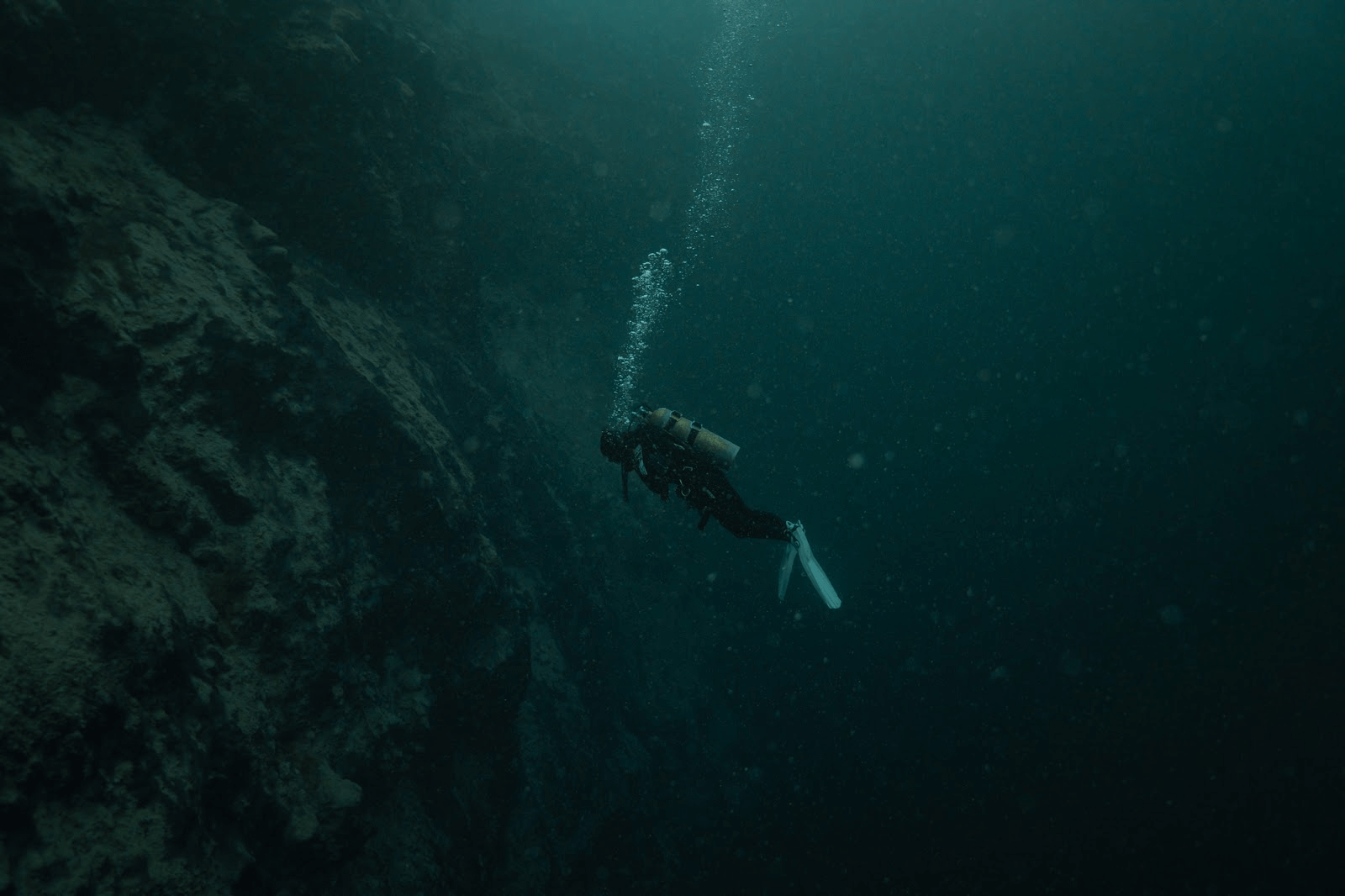 But besides this weird wall of otherworldly algae, there was nothing else down there with us. We were completely alone in a hole that dropped 450 meters below sea level. Void of life, this was a chasm that harbored secrets, but what those were we could not tell you in the slightest. Where it descended below that 45.5 meters was an utter mystery. As we worked our way up the wall, and moved away from the mini explosions, the water was clear as could be. It was also completely still—no currents, no surges. At times, it almost felt like we were in bathwater, or perhaps not even underwater at all.