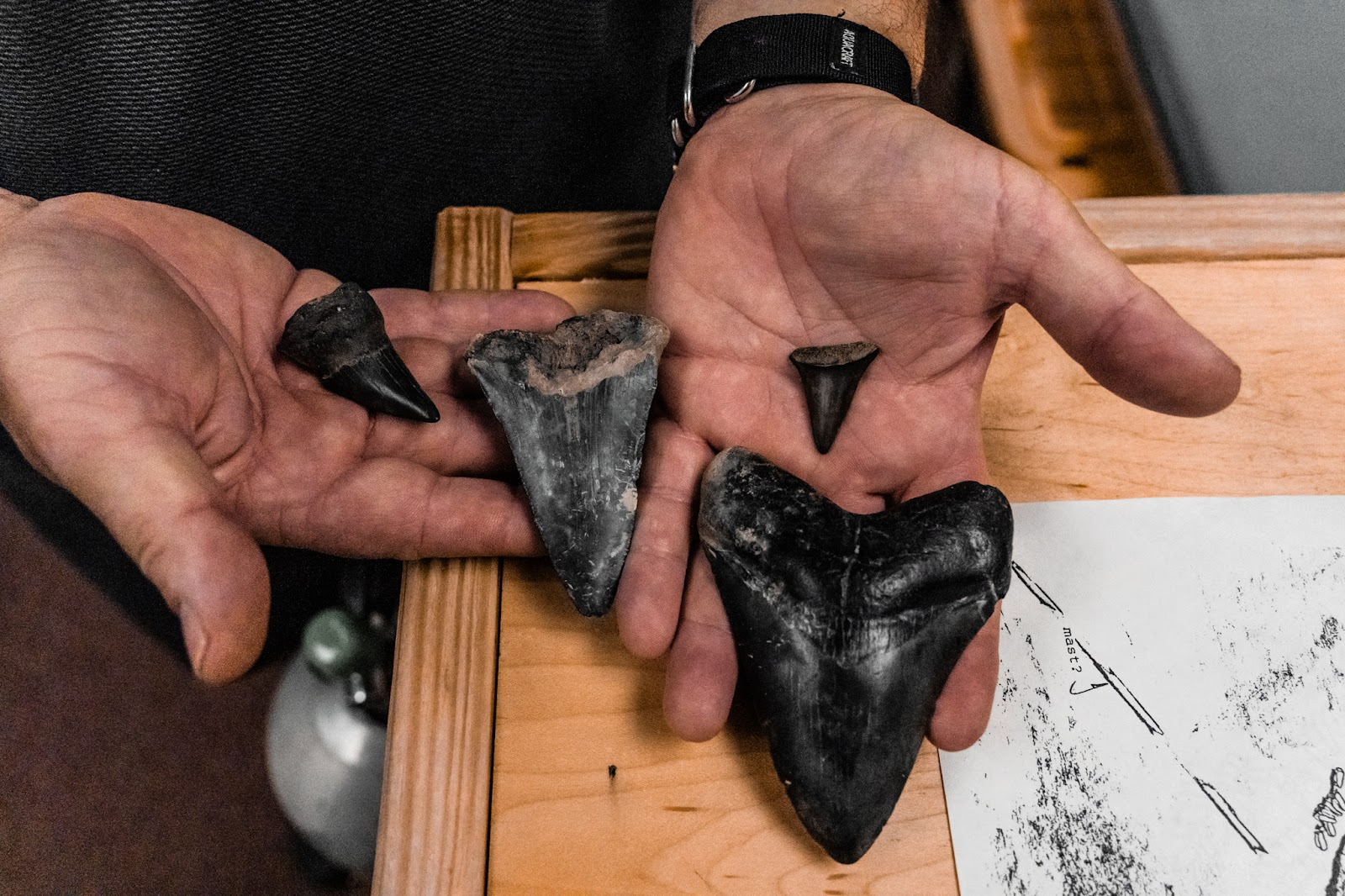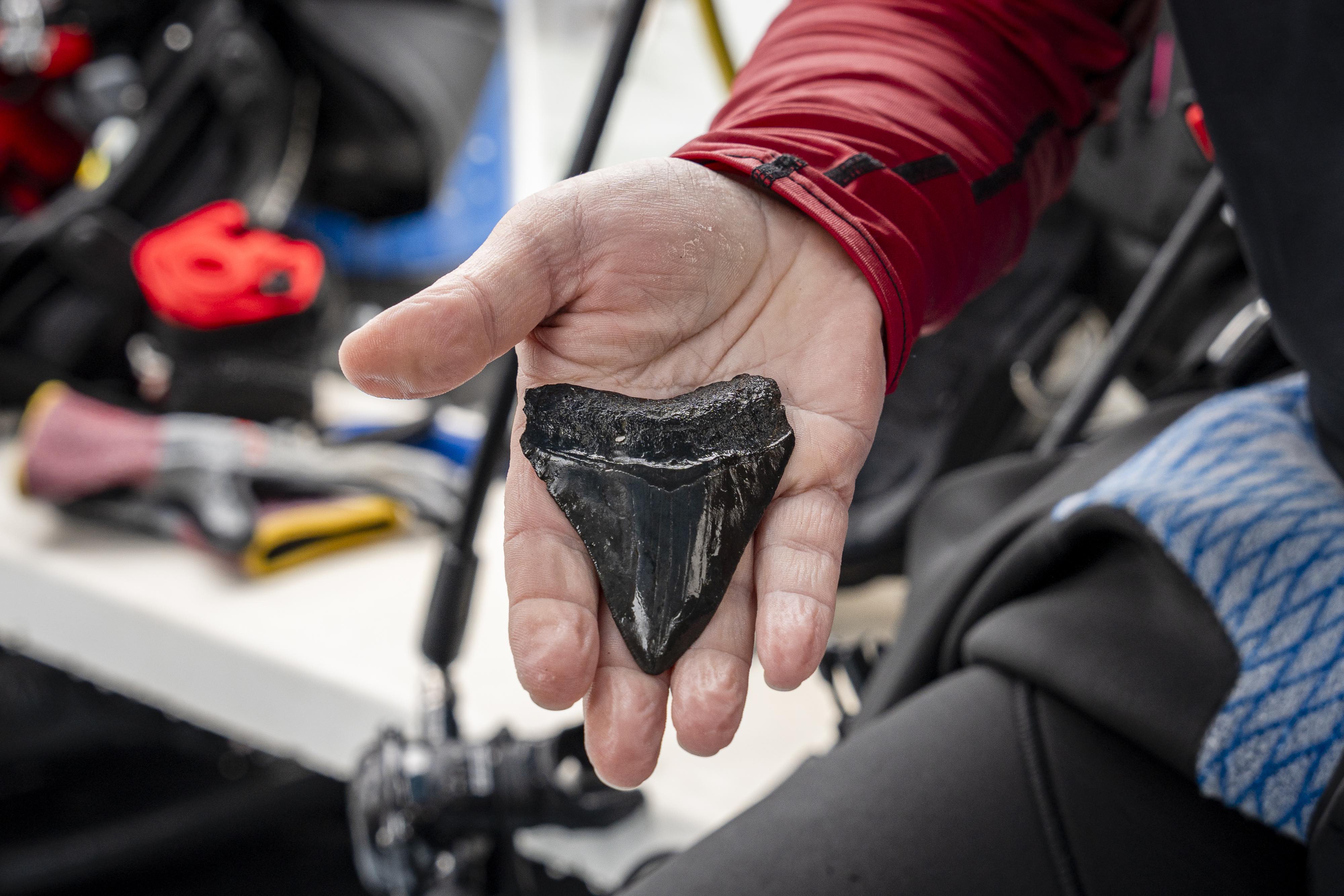 As a child, I would search for rocks, minerals, and fossils with my father, never imagining I’d one day be covered in mud at the bottom of a river, scuba diving for prehistoric treasures of this scale and size. Brian’s massive tooth was close to five inches long, one of the largest found in these parts. It was brownish-black, indicating it was perfectly fossilized—a stark contrast to the white teeth of more recently deceased sharks. Fossilized teeth are impressions of what the tooth once was, petrified over eons and left for us to discover. The rocks we found were in perfect formation, including fossilized teeth from great whites, mako sharks, sand tigers, and more massive megs.