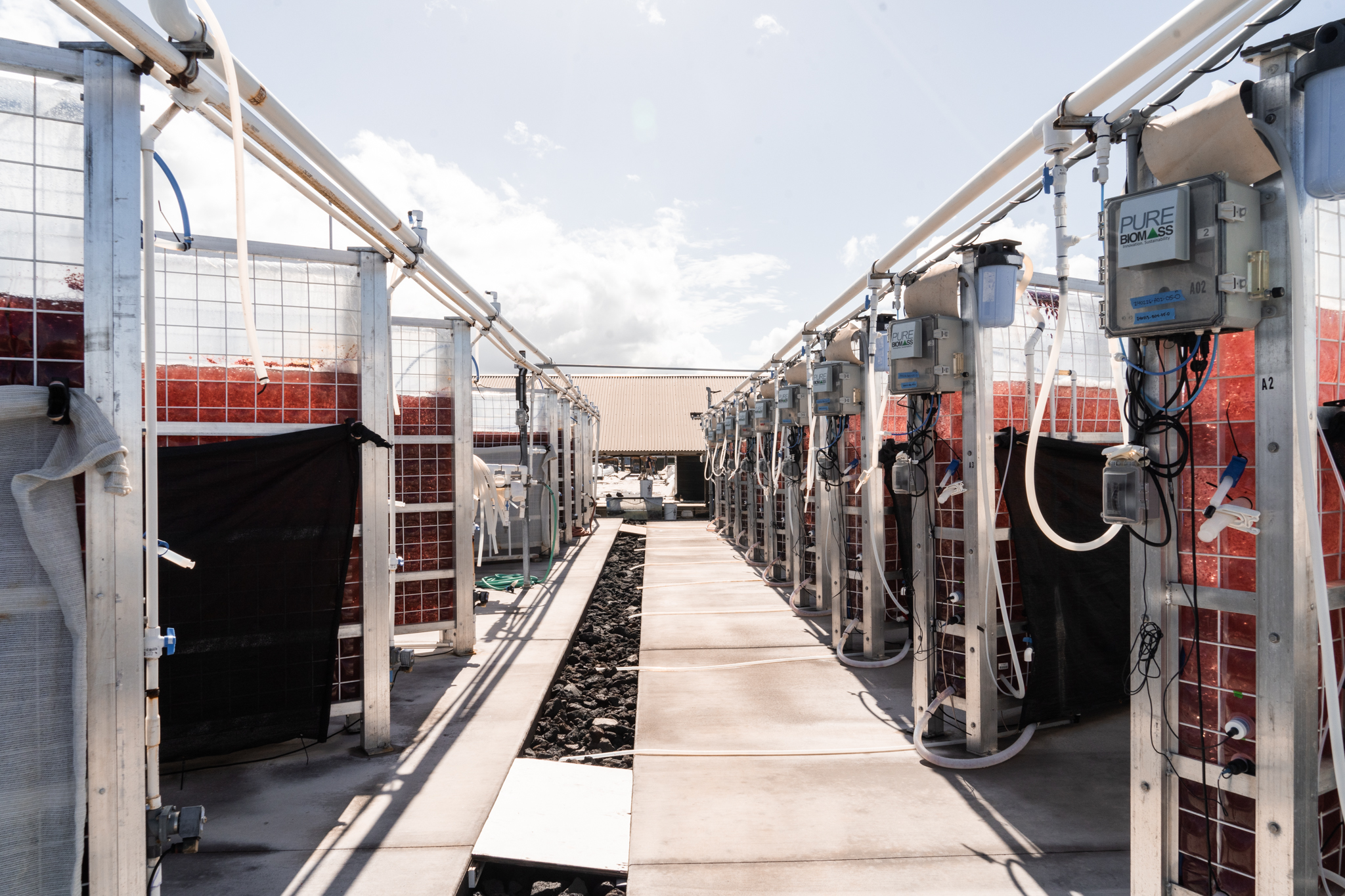 The setup housing the puffs outside on the pads are called the photo-bioreactor (aka PBR). It’s here that the algae is exposed to natural elements, especially sunlight, mimicking nature’s process to drive puff growth. The goal out here is to enhance the production of bromoform—a crucial compound in reducing methane emissions that’s found within algae. Bromoform sacs within the algae are considered the ultimate marker of success, making this one aspect the most essential component of Symbrosia’s research.