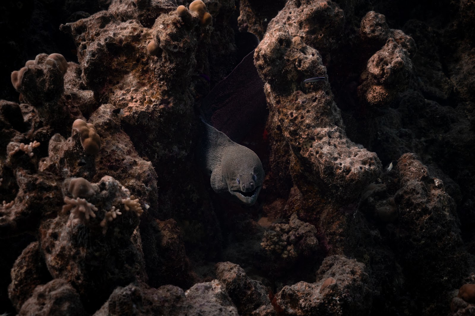 It felt both ancient and intact, yet you could almost trace the changes that had unfolded over time. Coral walls rose from the seabed to just a few meters below the surface, creating layers of shelves, caves, ridges, and channels that formed intricate underwater structures. In every nook and cranny, giant clams were placed perfectly, ranging from tiny to impressively large—big enough to remind you to keep your distance. Their color palettes were otherworldly, shifting from vibrant purples to yellows, blues, and greens, almost iridescent as the sunlight filtered through the water. In this slice of coral garden, the more closely you looked, the deeper you saw into the heart of the Red Sea.