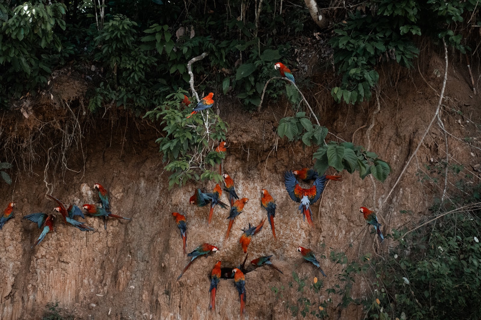 But even so, we still waited in total silence with hardly any movement from 10:30am - 1:30pm for the action to finally happen. Close to 30 Scarlet macaws along with a handful of red and green macaws were hovering around the claylick area, talking to each other and debating taking action. Since it’s a spot that leaves them extremely vulnerable, there’s deep bird deliberation among the group for when the time is right to begin the licking.