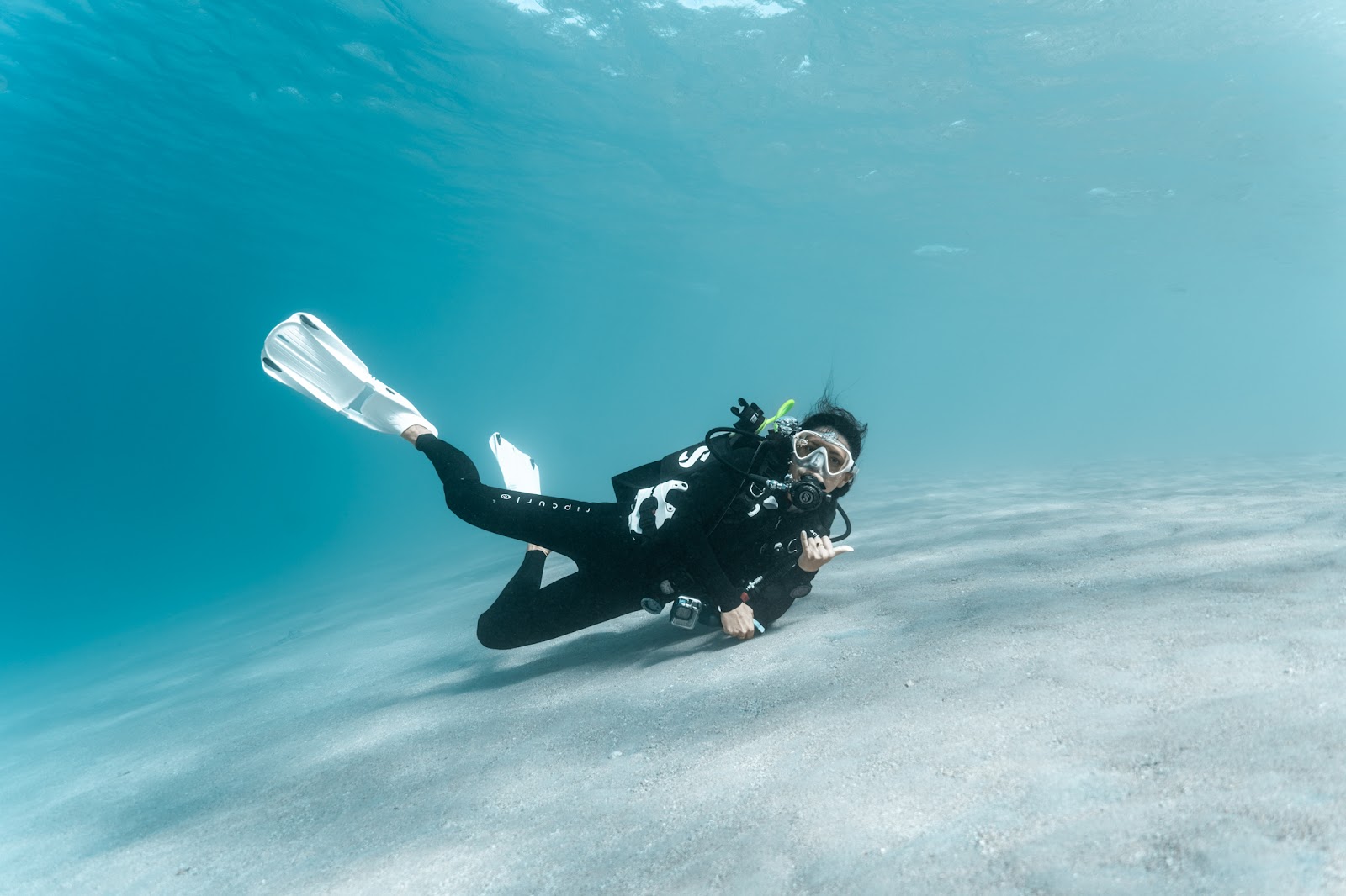 Not many humans have donned scuba gear in these waters. With only two boats in sight in the entire area, we had this open ocean all to ourselves. With tanks and kits now assembled, we jumped in the 28 degree water, and this team of six were off to find majestic dugongs. Sethric leading the charge.