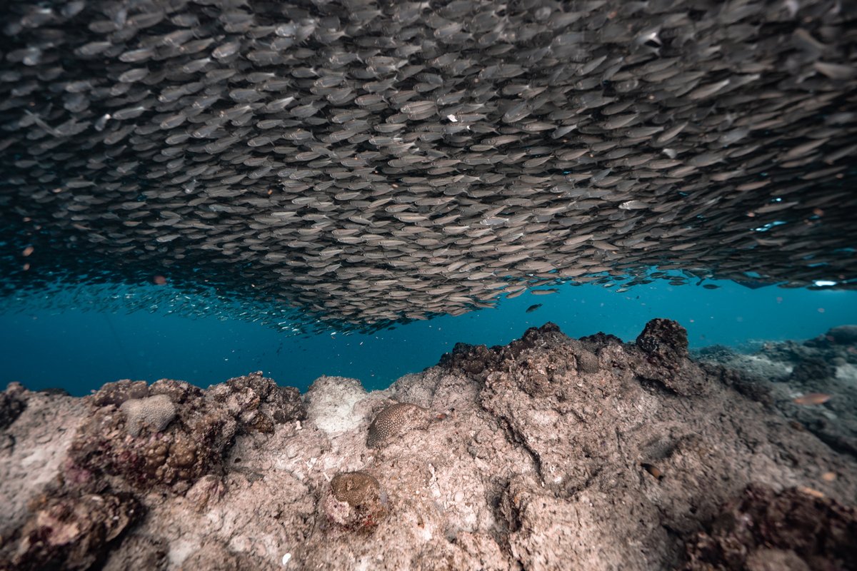 Moalboal’s sardine run is, for now, always on. Just offshore, millions of sardines swirl in dense, shifting walls that shimmer like liquid silver, forming one of the largest resident bait balls in the world. Predators patrol constantly—jacks, tuna, thresher sharks, and the occasional dolphin dart through the chaos. It’s a rare chance to drop into an ever-present spectacle of raw abundance.